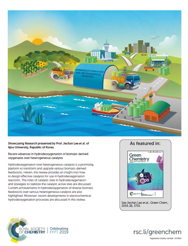 우리학교 이제찬 교수 연구팀(환경안전공학과)의 논문이 해외저널 에 표지논문으로 선정됐다.이제찬 교수 연구팀은 지난 21일 친환경 바이오에너지 촉매기술 관련 논문이 14호에 게재됐다고 22일 밝혔다. 는 지속가능한 과학기술(Green & Sustainable Science & Technology) 분야 순위 2위인 저널로, 우리 학교 연구팀의 논문이 해당 저널의 표지논문으로 실렸다. 논문 제목은 'Recent advances in hydrodeoxygenation of biomass-derived oxygenates over heterogeneous catalysts'이다. 우리 학교 김수산 학생(환경공학과, 석사과정)이 제1저자로 참여했다. 이제찬 교수는 "이번 논문의 연구가 친환경 바이오연료의 품질을 화석연료 수준으로 높이는 공정기술개발 및 상용화에 기여할 수 있을 것이라 생각한다"고 말했다.