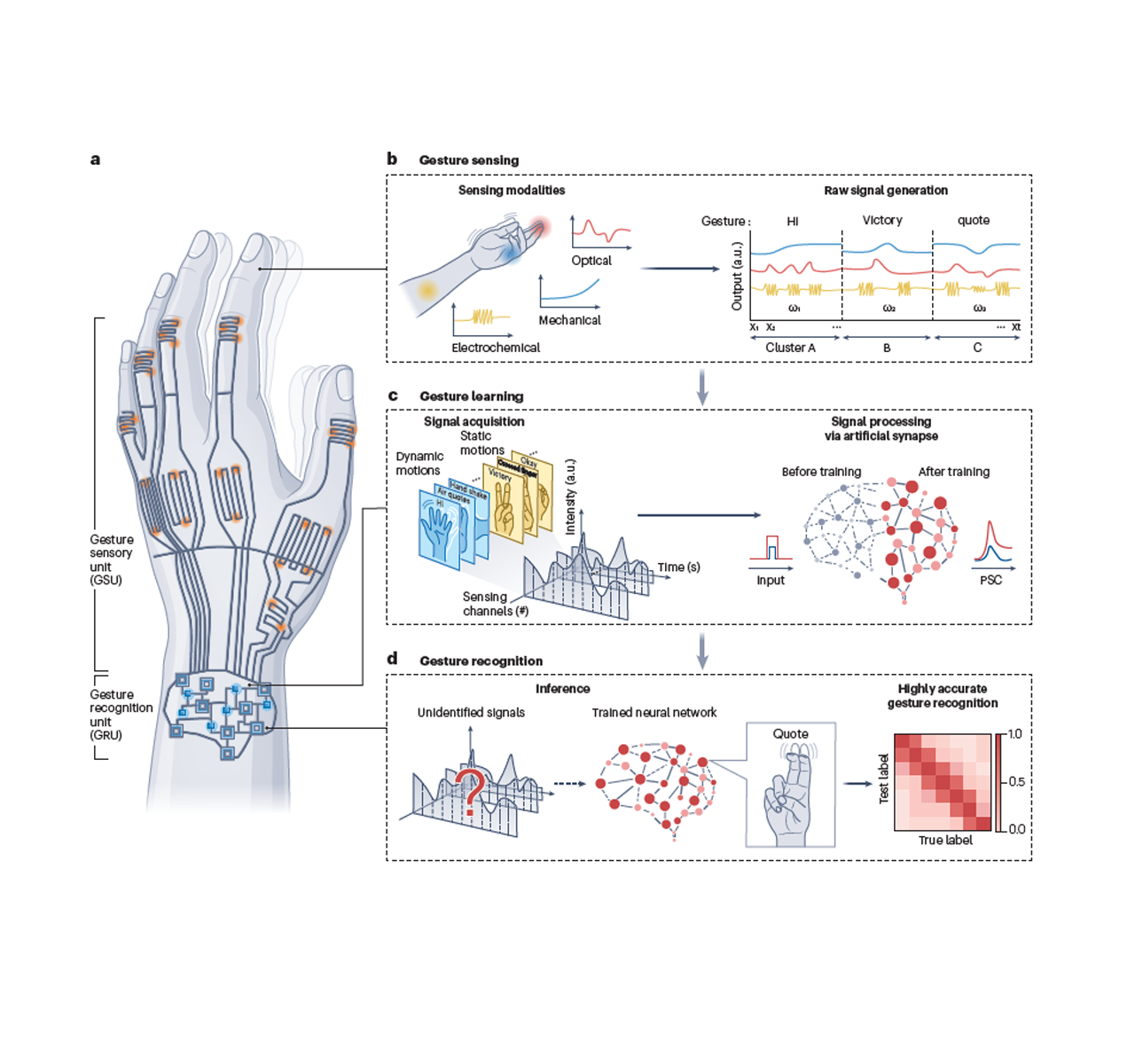 아주대 연구진이 피부 밀착형 초유연 전자소자를 기반으로 한 차세대 지능형 제스처 인식 플랫폼의 연구 로드맵을 제시했다. 헬스케어와 로봇공학 등 첨단 분야의 핵심 기술로 활용되고 있는 지능형 제스처 인식기술의 연구에 널리 활용될 수 있을 전망이다. 박성준 아주대 교수 연구팀은 왕건욱 고려대 교수 연구팀과 함께 피부에 밀착되는 초유연 전자소자를 기반으로 한 지능형 손짓 제스처 인식기술의 최신 동향을 종합 분석한 리뷰(review) 논문을 발표했다고 밝혔다. 이번 리뷰 논문은 ‘지능형 제스처 인식을 위한 피부 맞춤형 전자 장치(Skin-conformal electronics for intelligent gesture recognition)’라는 제목으로 글로벌 저명 학술지 <네이처 리뷰 일렉트리컬 엔지니어링(Nature Reviews Electrical Engineering)> 10월호에 게재됐다. 이번 연구에는 아주대 지능형반도체공학과 박사과정 이인호 학생, 고려대 KU-KIST 융합대학원 박사과정 신효진 학생, 미국 버지니아대 조해인 박사가 공동 제1저자로 참여했다. 아주대 박성준 교수(전자공학과·지능형반도체공학과)와 아주대 최준규 연구원(정보통신전자연구소), 고려대 왕건욱 교수(KU-KIST 융합대학원 융합에너지공학과)는 교신저자로 참여했다.제스처 인식(Gesture recognition) 기술은 인간의 손짓과 동작을 전기 신호로 변환해, 센서 등의 장치를 통해 기계가 감지하고 반응하도록 하는 기술을 의미한다. 가상현실(VR)과 증강현실(AR), 로봇공학 분야와 인간-기계 인터페이스(Human-Machine Interface) 그리고 헬스케어 등의 분야에서 제스처 인식기술은 중요한 화두가 되어 왔다. 제스처 인식기술을 이용하면 메타버스를 비롯한 확장현실(XR) 환경에서 사용자의 몰입감을 높이고, 맞춤형 의료 서비스에서 환자의 동작 데이터를 실시간으로 수집하며, 로보틱스 제어의 직관성 및 안전성을 강화하는 등 버튼이나 음성 명령을 대체하는 수준 이상의 활용이 가능하다. 그러나 지금까지의 제스처 인식 시스템은 ▲카메라 ▲적외선 센서 ▲장갑형 웨어러블 기기 등에 의존해왔고, 이러한 방식은 여러 구조적 한계를 보여왔다. 전력 소모가 큰데다 카메라 등 기기가 위치한 곳에서만 활용이 가능해 공간적 제약이 있고, 센서나 기기의 부피가 크고 구조가 복잡해 착용이 어렵고 정밀도가 떨어지는 것. 손가락 동작이 가능한 전자 피부 등 관련 분야를 연구해온 아주대·고려대 공동 연구팀은 기존의 기술과 연구에 대한 심층 분석을 통해 손짓 제스처 인식기술의 구조적 한계를 극복하기 위한 피부 부착용 초박막·초유연 전자소자 기반 플랫폼을 제안했다. 초박막·초유연 전자소자 기반 플랫폼은 다양한 센싱 모듈–뉴로모픽 시냅스 소자–인공지능 인식 유닛이 결합해 작동하며, 실제 생활 환경에서도 안정성과 신뢰성을 확보할 수 있다. 전체 구조는 초박막·초유연 전자소자로 구현되어 피부와 자연스럽게 일체화된다. 이를 통해 간편한 장치로 세심하고 민감하게 손동작을 인식할 수 있게 됨으로써 기존 장치들의 한계로 여겨져 왔던 착용감, 내구성, 신뢰성의 한계를 동시에 보완할 수 있다. 연구팀은 리뷰 논문에서 제안 플랫폼의 세부 구성을 구체적으로 제시했다. 우선 ▲제스처 센서는 손가락 관절, 근육, 표면 근전도, 광학적 변화 등 다양한 생체 신호를 높은 감도와 빠른 응답 속도로 포착한다. ▲뉴로모픽 시냅스 소자는 가소성(plasticity)을 조절해 반복되는 제스처 패턴을 학습·기억할 수 있도록 하고 ▲인공지능 인식 유닛은 CNN, RNN, 리저버 컴퓨팅 등 알고리즘을 적용해 정적·동적 동작을 실시간으로 분류·해석한다. 공동 연구팀은 이 세 가지 요소가 유기적으로 작동할 때, 단순한 동작 검출을 넘어 학습과 추론이 가능한 지능형 인간–기계 인터페이스가 구현된다고 강조했다. 이러한 분석은 단순한 기술적 성과를 넘어, 인공지능 전환(AI Transformation, AX) 시대가 요구하는 지능형 상호작용 플랫폼의 청사진을 보여준다.연구팀은 앞으로의 발전 방향에 대한 제안도 내놨다. 먼저 기존 웨어러블 기기에서 초박막·초유연 장치로의 진화를 통해 사용 편의성과 안정성을 강화해야 하며, 이를 위해 특히 반복적인 구부림이나 주름 변형 속에서도 장기간 감도를 유지할 수 있는 신소재 개발이 필수적이라고 설명했다. 또한 전기·광학·기계 신호를 융합하는 멀티모달 센싱 체계의 필요성도 강조했다. 복잡한 제스처에도 실시간 반응성을 확보하고, 단일 센서로는 얻기 어려운 고차원 정보를 추출할 수 있는 기반을 마련할 수 있어서다. 왼쪽부터 이인호 박사과정생, 최준규 연구원, 박성준 교수더 나아가 손끝의 미세한 움직임이나 피부의 광학적 변화 등을 안정적으로 포착하는 정밀 감지 기술도 요구된다. 연구진은 여기에 뉴로모픽 연산 방식을 접목할 경우, 인간의 학습·기억 메커니즘을 전자 장치에서 구현할 수 있어 단순 감지를 넘어 반복적 행동 패턴을 학습·적응하는 지능형 플랫폼으로 발전할 수 있다고 분석했다. 이는 단순히 손가락의 위치를 읽는 수준을 넘어, 손동작의 힘과 속도, 연속성, 맥락을 함께 이해해 ‘사용자의 의도’를 파악하고 선제적으로 반응하는 차세대 인터페이스로 발전할 